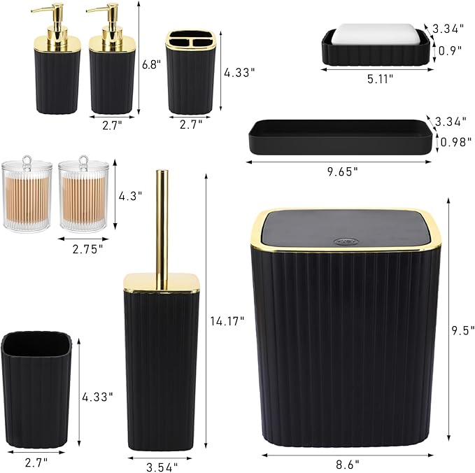 • MATERIAL: Bathroom accessories set made out of premium plastic, think and sturdy. The pump head is coated stainless steel paint, prevent rust and corrosion. The various accessories inside satisfy your use of the bathroom set. Buy this bathroom accessories set, you will not need to purchase additional products. Our black bathroom accessory set is fully covered.