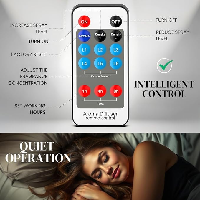 • Enjoy a quiet, customizable scent experience with the Luxscent Aroma Diffuser. Covering up to 1000sq. ft., it features remote control, continuous mode, and a programmable timer (1, 4, or 8 hours) for effortless aroma control in any space.