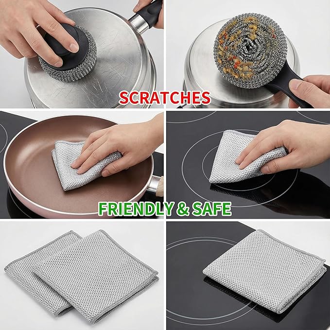• Thorough & Gentle Cleaning: These wire dishwashing rags effectively remove stuck-on food and grime from dishes, pots, and pans. The non-scratch wire dish cloth and fine silver mesh surface ensure a powerful yet safe clean that won't damage your delicate cookware